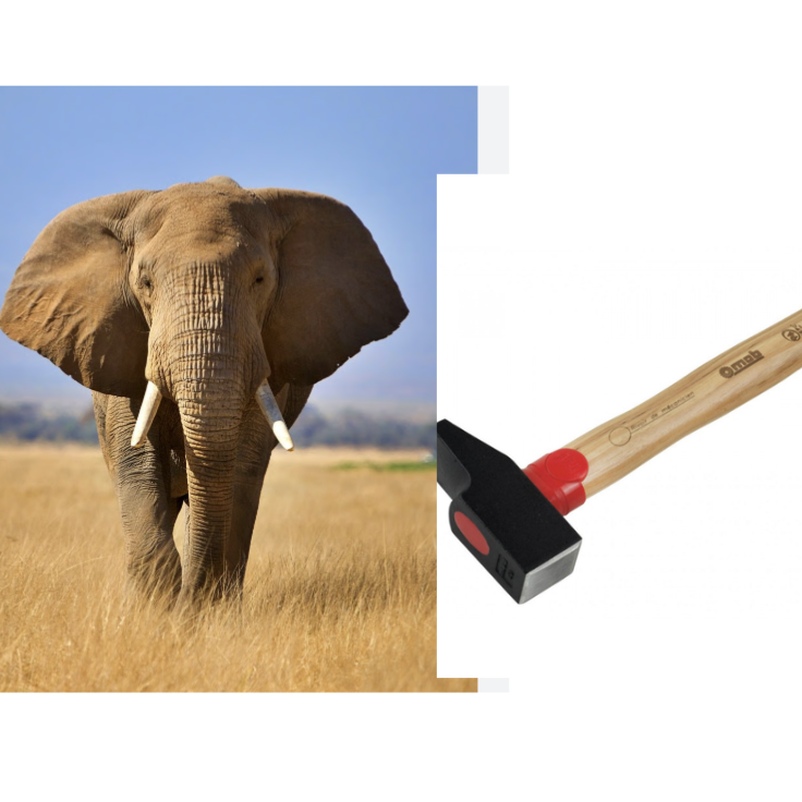 À la fin, fatigué, le marteau saute… direct dans la trompe de l’éléphant.
